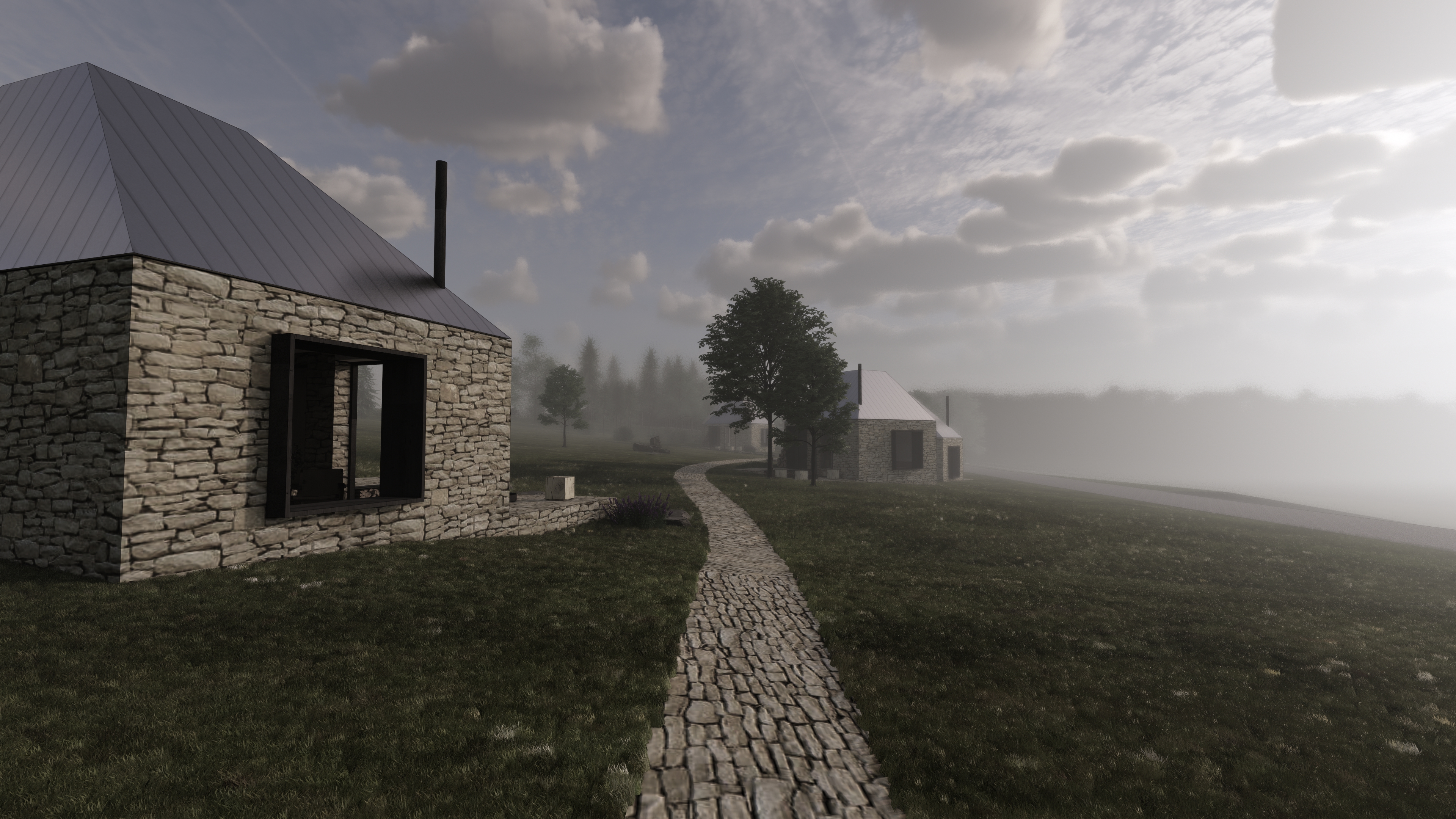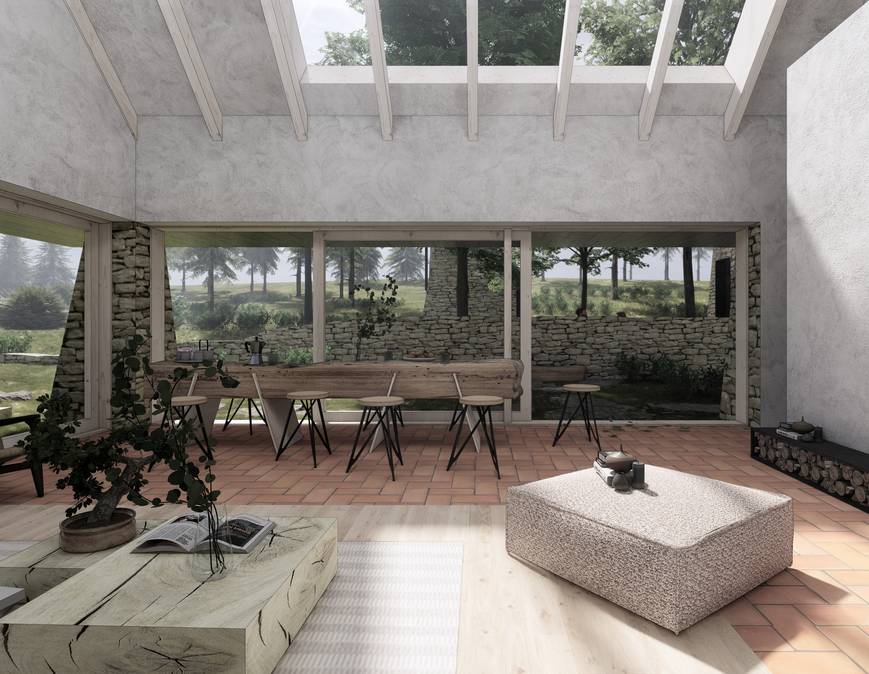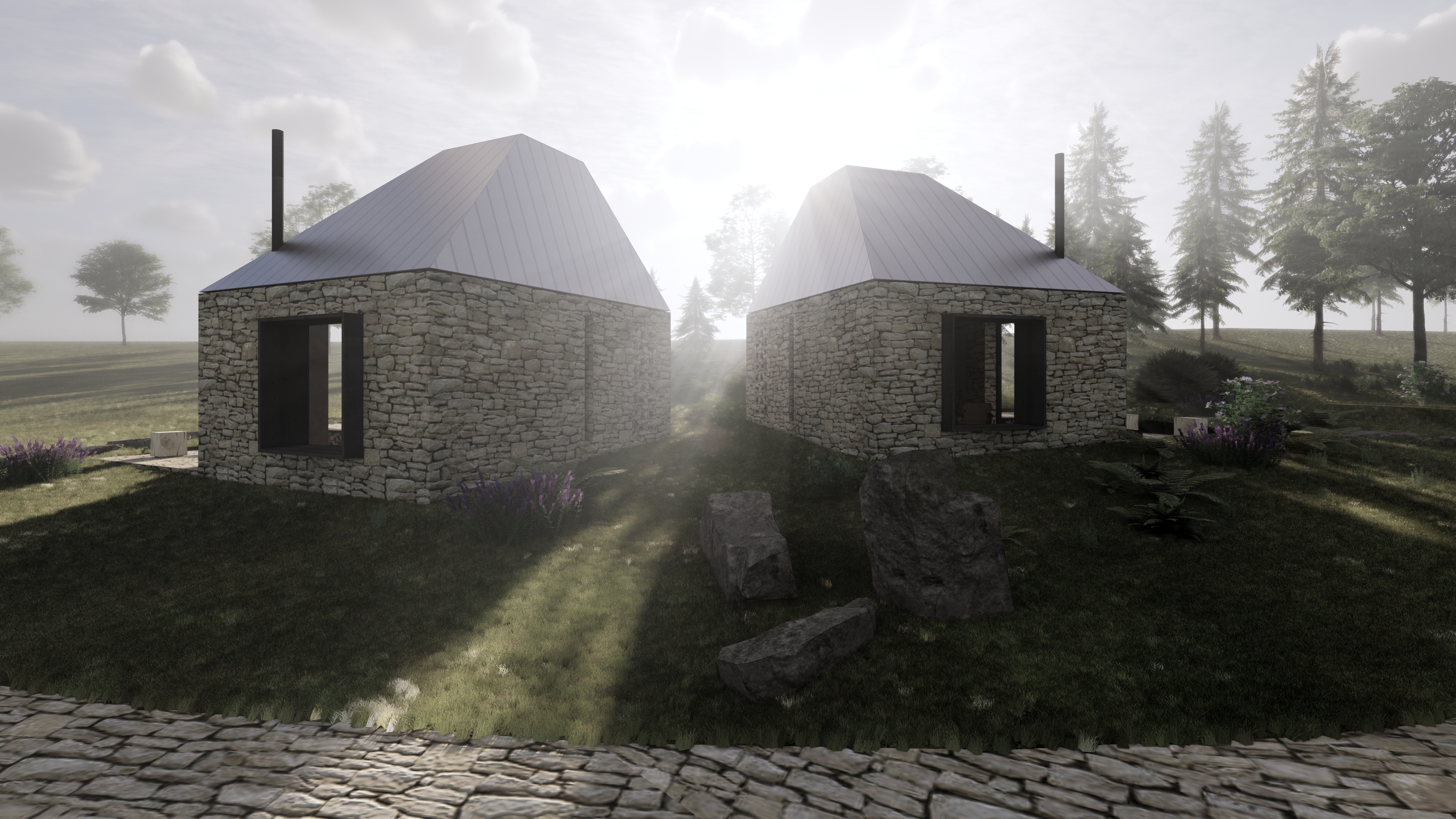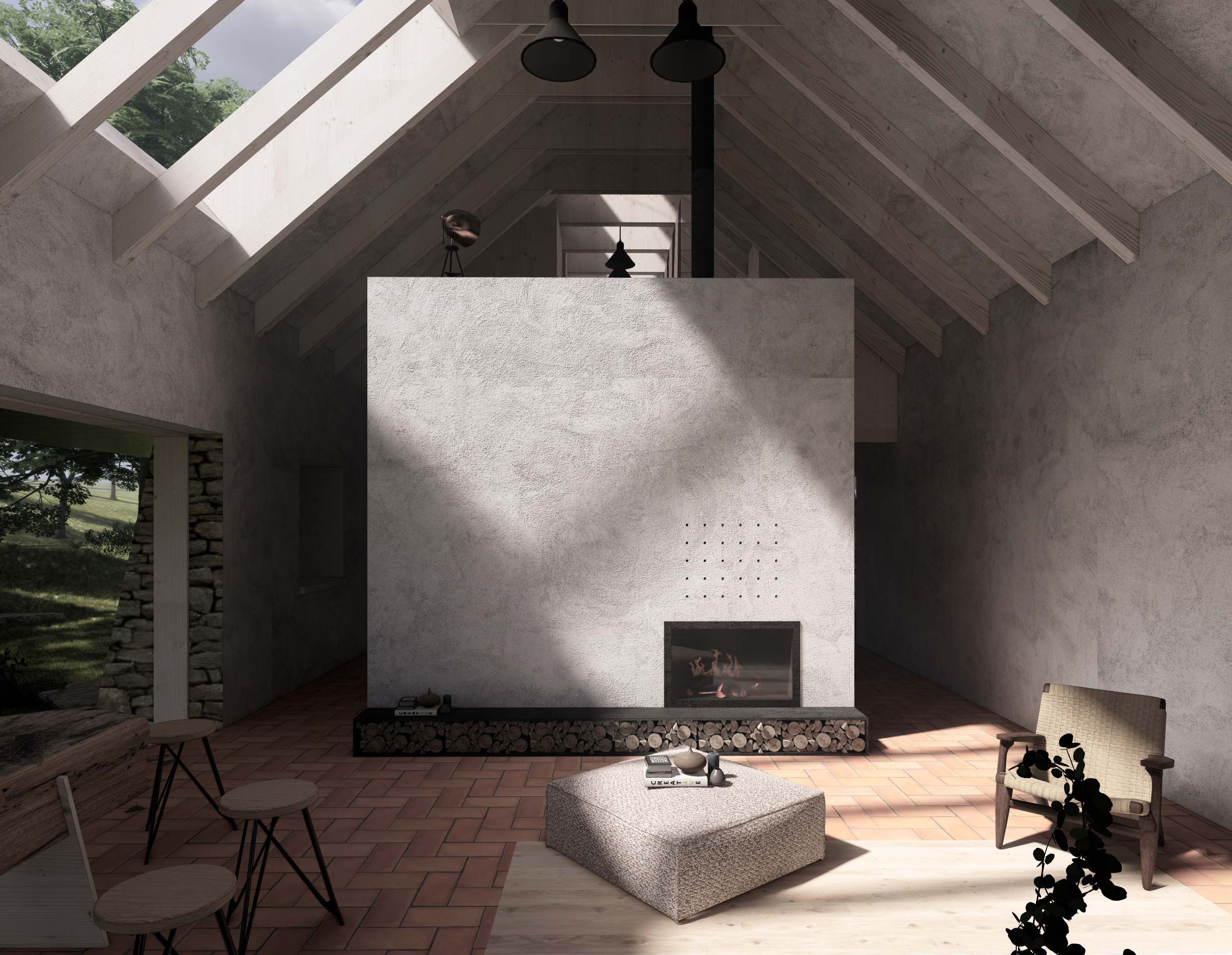 The renovation design is based on the rural character of the location and aims to create unobtrusive, simple architecture that blends naturally into the environment. The main building, the barn, serves as a communal meeting place and continues the tradition of rural buildings in terms of its appearance and material design. The traditional three-room design (“pitvor” – hallway – storage room) has been reinterpreted and adapted for contemporary use, consisting of a room, an entrance area with technical and sanitary facilities, and a communal area. The entrance is covered by a distinctive gable roof overhang, creating a natural transition between the exterior and interior while referencing the archetypal form of the house. The complex also comprises smaller accommodation cabins with skylights to bring natural light and a sense of mystery to the interior. The atmosphere is complemented by a freestanding sauna which also makes use of natural light and simple forms. Rather than creating a striking architectural feature, the buildings quietly enhance the quality of their surroundings through an emphasis on scale, functionality, and attention to detail.